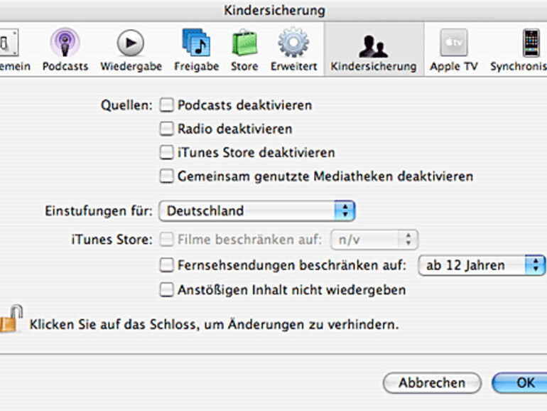 Öffnet man in iTunes 7.6 die Einstellungen (über den Menüpunkt "iTunes") und geht in die Kindersicherung, lässt sich nun auch bei "Einstufungen für:" Deutschland als Land auswählen und der Punkt "Fernsehsendungen beschränken auf:" wird aktiv. Eingestellt werden kann dann in einem Pulldown-Menü die entsprechende Altersbeschränkung. Inaktiv bleibt hingegen weiterhin die Filmbeschränkung. Bald also könnte der iTunes Store auch deutsche TV-Serien oder zumindest -Sendungen im Angebot haben. Wann das der Fall sein wird, ist hingegen weiterhin unklar.