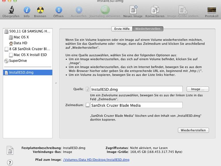 OS X Lion: So erstellen Sie Ihre eigene Installations-DVD Schritt 3: Image auf einen USB-Stick kopieren