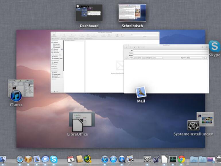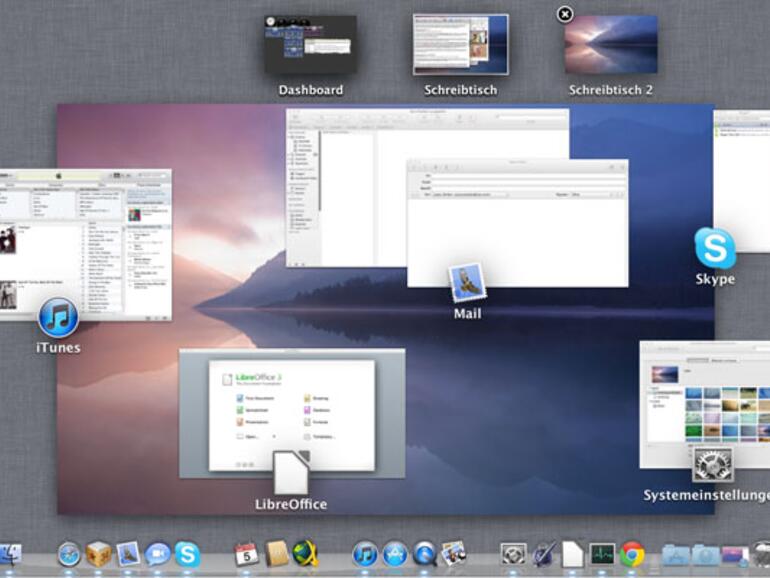 Sind in einem Programm meherere Fenster geöffnet, beispielsweise verschiedene Textdokumente, kann mit einer Scrollgeste in den Stapel hineingezoomt werden, um so mehr Details erkennen zu können: Alle anderen Apps treten dann in den Hintergrund. Wer eine Magic Mouse sein Eigen nennt, erreicht Mission Control durch ein Doppeltippen mit zwei Fingern auf der Mausoberfläche.