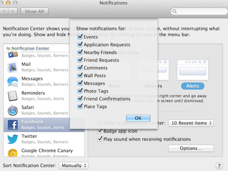 Nur eine Woche nach der Veröffentlichung der Developer Preview 4 von OS X 10.8, gibt Apple jetzt die 1,08 GB große Aktualisierung mit der Build-Nummer 12A248 an seine Entwickler. Bei den Einstellungen der Benachrichtigungs-Zentrale finden sich hier in der Rubrik „Facebook Badges, Sounds, Alerts“ die Optionen für den Umgang mit Neuigkeiten aus dem sozialen Netzwerk.