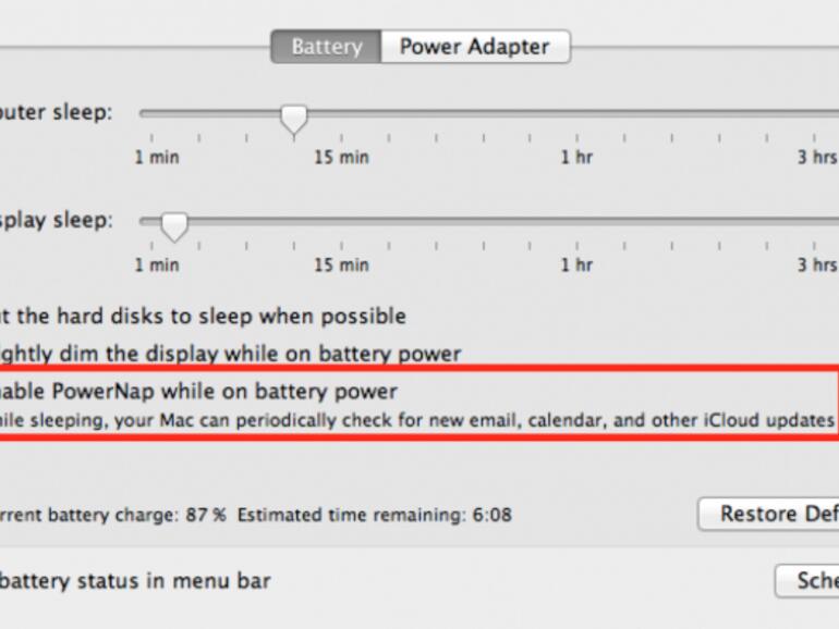 Wer ein MacBook Air ab der zweiten oder ein MacBook Pro der neuen Baureihen sein Eigen nennt, wird mit dem Berglöwen die Möglichkeit nutzen können, den Mac trotz Ruhezustands periodisch nach neuen E-Mails, Kalendereinträgen und anderen iCloud-Aktualisierungen schauen zu lassen. Diese von Apple „PowerNap“ getaufte Technologie lässt sich jetzt per Häkchen in den Systemeinstellungen aktivieren.