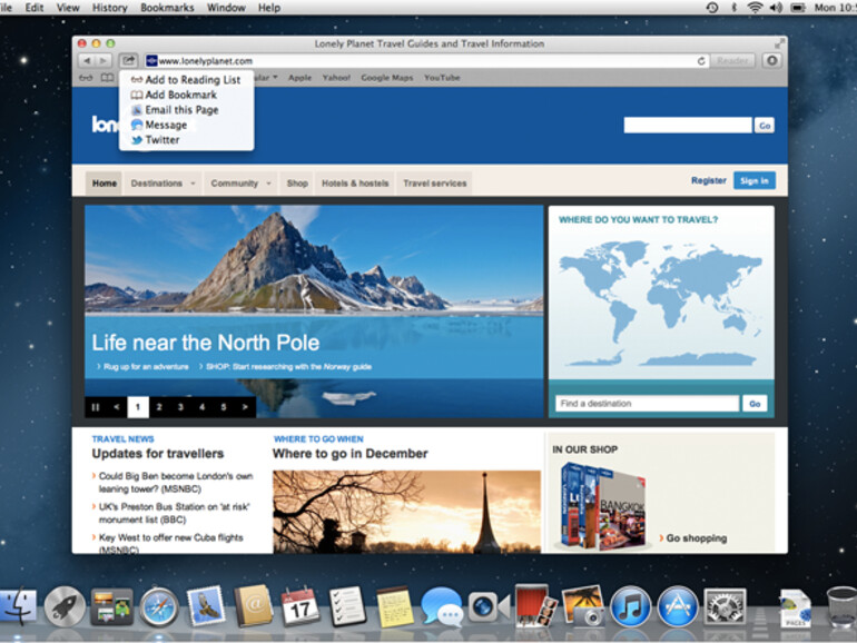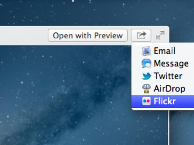 Besonders praktisch ist Share Sheet in der Vorschau-Funktion über die Leertaste: Neben der Schaltfläche zum Öffnen einer Text-, Bild-, Audio- oder Videodatei sowie anderen von Vorschau unterstützten Formaten, findet sich unter OS X 10.8 nun auch die Share-Sheet-Schaltfläche: Fotos und Videos können so mit wenigen Klicks geteilt und Dateien per AirDrop an andere Mac-Anwender geschickt werden. Unter Safari bietet Share Sheet zudem die Möglichkeit, Artikel in der Leseliste zwischenzuspeichern oder als Lesezeichen dauerhaft abzulegen.