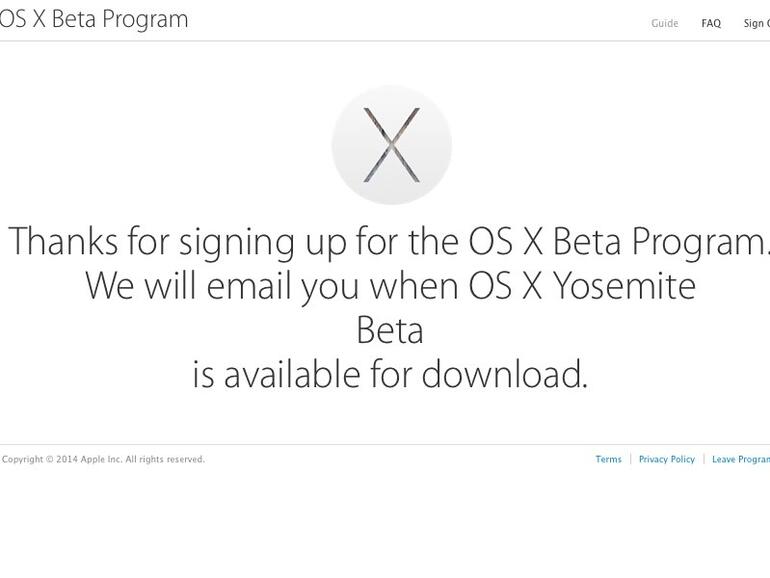 Sind die Geschäftsbedingungen akzeptiert, erhält der Teilnehmer die Nachricht, dass Apple eine E-Mail senden wird, sobald die OS X Yosemite Public Beta verfügbar ist. Diese E-Mail enthält dann einen Einlösecode, mit dem sich die OS X Yosemite Beta aus dem Mac App Store herunterladen lässt.