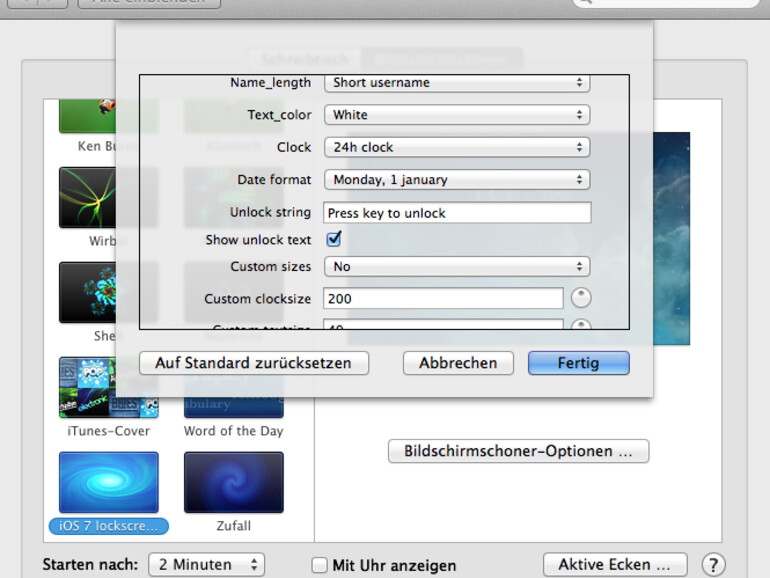 Die anschließende Einrichtung kann in den Systemeinstellungen unter Schreibtisch & Bildschirmschoner im Reiter Bildschirmschoner vorgenommen werden. Klicken Sie ganz unten auf iOS 7 lockscreen und anschließend auf Bildschirmschoner-Optionen. Hier gilt es vor allem die Uhr („Clock“) auf das 24h-Format einzurichten. Auch das Datum sieht im Format „Monday, 1 january“ deutlich besser aus. Möchten Sie auch die Entsperr-Anleitung auf Deutsch darstellen, muss im darunterliegenden Feld Unlock string der Text geändert werden, beispielsweise auf „Zum Entsperren eine Taste drücken“. Alle anderen Einstellungen können Sie getrost ignorieren.