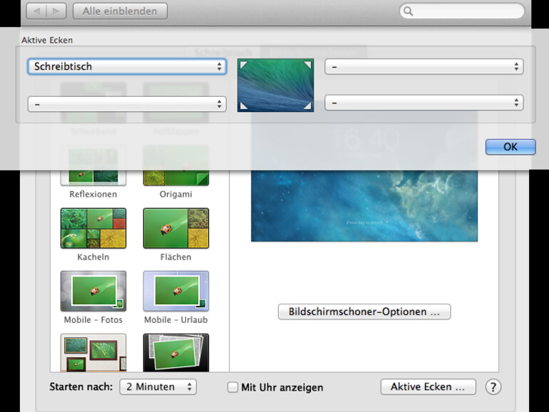 Um den Bildschirmschoner direkt und nicht erst nach einer bestimmten Zeit zu starten, gibt es zwei Möglichkeiten. Zum einen kann in den Systemeinstellungen unter Schreibtisch & Bildschirmschoner unten rechts eine Aktive Ecke definiert werden, in die Sie die Maus lediglich bewegen müssen, um den Bildschirmschoner zu starten.