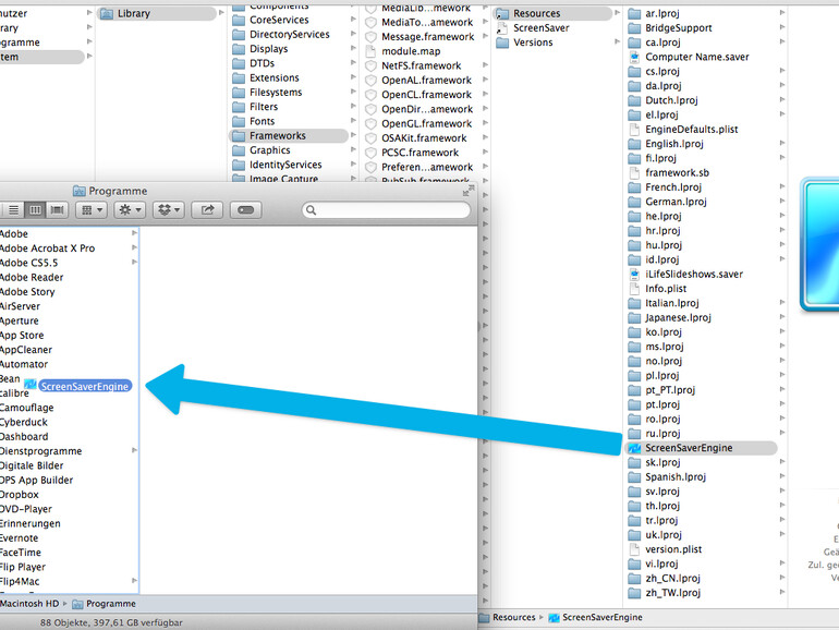 Alternativ können Sie auch eine Verknüpfung der tief im System versteckten Bildschirmschoner-App im Dock oder in Ihrem Programme-Ordner erstellen. Die App ScreenSaverEngine befindet sich unter System/Library/Frameworks/ScreenSaver.framework/Versions/A/Resources. Ziehen Sie die App einfach bei gedrückter alt- und cmd-Taste in den Programme-Ordner oder direkt in das Dock um eine Verknüpfung zu erstellen.