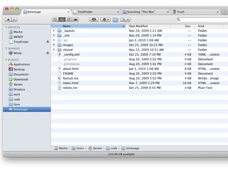 Als SIMBL-Plug-in wird der Finder in Snow Leopard während der Laufzeit verändert, die Programmdatei bleibt unverändert. Neben Tabs gibt es einige zusätzliche Einstellungen, mit denen man beispielsweise verhindern kann, dass der Finder DS_Store-Dateien auch auf Netzwerkmedien schreibt. Für lokal mit dem Mac verbundene Medien lässt sich das Schreiben der Dateien auf einen anderen Ordner umleiten. Außerdem können Ordner in Dateilisten immer oben angezeigt werden, ähnlich wie unter Windows.