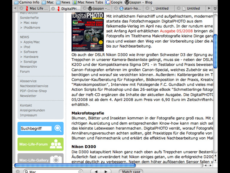 Verschiedene Anwendungen setzen bereits Sparkle zur automatischen Software-Aktualisierung ein - jetzt auch Camino. Ein Besuch der Seite ist damit überflüssig, es reicht, den neuen Menüpunkt im Camino-Menü zu wählen, um festzustellen, ob es eine neue Version gibt. Außerdem erscheinen in Camino 1.6 nun Pfeile, wenn nicht alle Tabs in das Fenster passen. Websites mit OpenSearch-Plug-in können einfach dem Suchfeld in der Werkzeugleiste hinzugefügt werden.