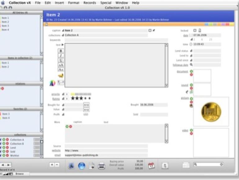 Features sind unter anderem die Multimedia-Fähigkeit mit Integration von QuickTime und iPhoto, die integrierte Tonaufnahme-Möglichkeit für akustische Notizen und Import/Export-Möglichkeiten in Excel XLS- und ASCII-Format.