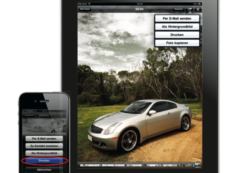 Bei Anwendungen auf iPad und iPhone unter iOS 4.2 verfügt der Aktionen-Knopf über den neuen Menüeintrag Drucken. Dies betrifft etwa die Foto-App, die hier zu sehen ist, aber auch den Browser Safari, Mail und eine Reihe weiterer iOS-Apps.