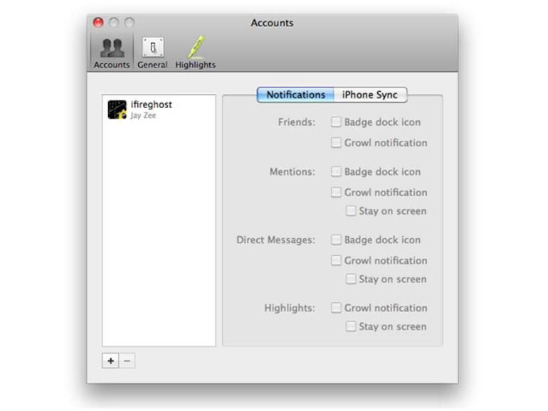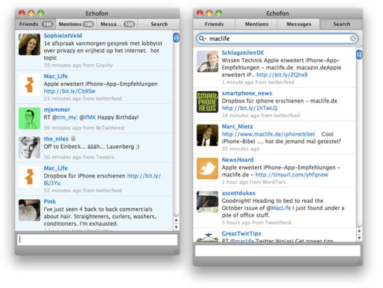 Ein besonderes Merkmal ist die Synchronisation zwischen dem Desktop-Programm und der iPhone-Applikation. Alte Tweets werden somit auch auf dem jeweils anderen Gerät als gelesen markiert. Einzige Voraussetzung: Die kostenpflichtige Variante der Twitter-Applikation, Echofon Pro [iTunes-Link].