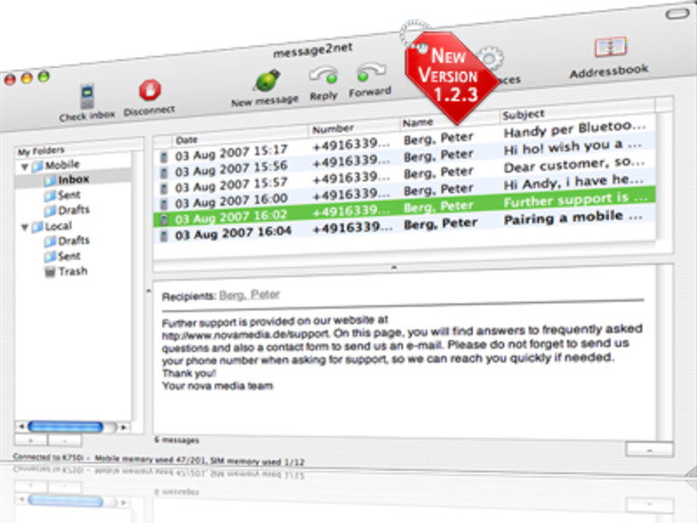 message2net liegt als Universal Binary vor und unterstützt neben Empfang und Versand von SMS-Nachrichten auch Multipart-SMS und Gruppen-SMS und bietet direkten Zugriff auf das Adressbuch von Apple sowie auf die Kontakte der SIM-Karte. Eingehende Nachrichten können direkt beantwortet, weitergeleitet und archiviert werden.