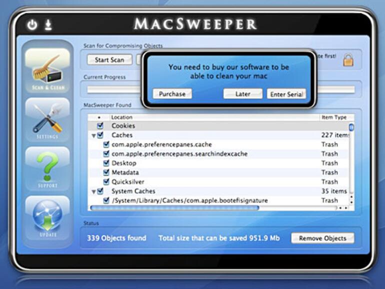 Mit dem zunehmenden Marktanteil von Mac OS X scheint die bis vor einigen Monaten nur auf der Windows-Plattform bekannte Masche also auch auf Apple-Systemen rentabel zu werden. Noch ist der mittlerweile zweite Anlauf für das aufmerksame Auge aber noch nicht ganz glaubwürdig: die Magazine, von denen die vermeintlichen Auszeichnungen der Software stammen sollen, sind allesamt frei erfunden und die Geschäftsbedingungen schließen - für kommerzielle Software unüblich - jegliche Haftung und Funktionstüchtigkeit der Software aus. Sogar die Webseite unterscheidet sich von der MacSweeper-Seite nur durch die unterschiedliche Bezeichnung des Programms.