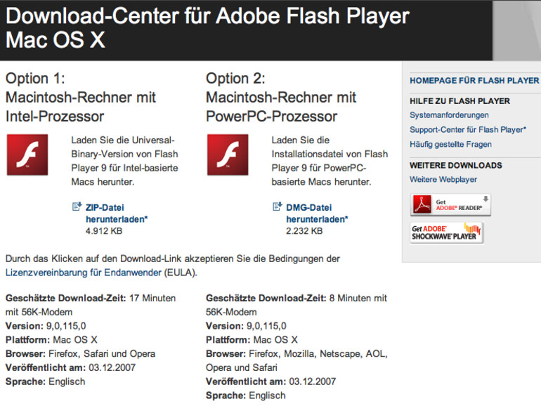 Die macnotes-Kollegen empfehlen, auf die vorherige Version 9r47 zurückzugehen. Dazu lädt man die 73 MB große Datei fp9_archive.zip von Adobe, entpackt die Datei flashplayer9r47_ub_mac.dmg.zip und installiert Flash über die neuere Version.