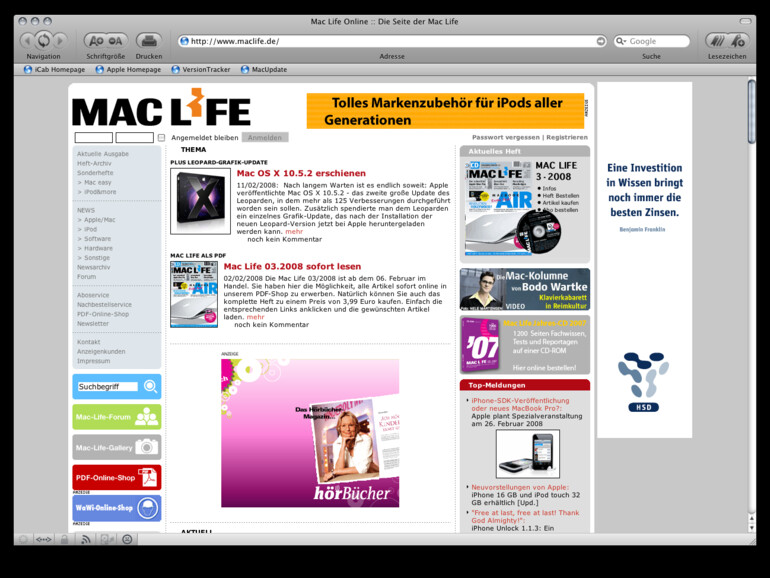 Es ist zwar schon einen Augenblick her, aber auf kleine Software-Projekte kann man auch häufiger hinweisen, am 1.1.2008 erschien die vierte Version von iCab. Das Programm ist vollständig neu erstellt und setzt jetzt auf moderne Cocoa-Programmbibliotheken und nicht mehr auf Carbon. Ab Mac OS X 10.3.9 läuft iCab sowohl auf Intel- wie auch PowerPC-Macs. iCab ist Shareware und kostet 25 Euro.