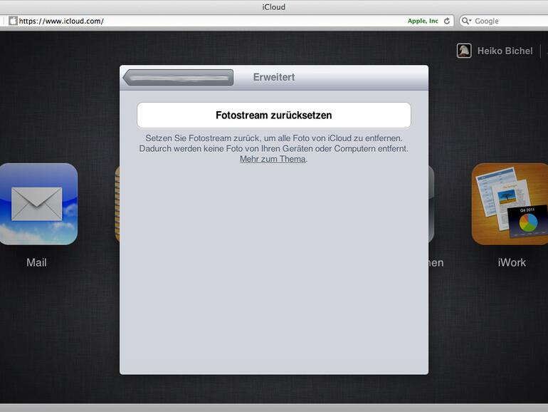 Es ist leider nicht möglich, einzelne Fotos aus dem Fotostream zu entfernen. In der Regel möchte man jedoch nicht, dass jedes einzelne geschossene Bild automatisch im Fotostream landet. Wer möchte, kann seinen Fotostream über icloud.com zumindest komplett zurücksetzen. Melden Sie sich dort an, klicken Sie dann rechts oben auf Ihren Namen und dann auf „Erweitert“. Alle Fotos aus dem Fotostream in der iCloud werden gelöscht, bereits auf Geräte übertragene Fotos sind davon nicht betroffen.