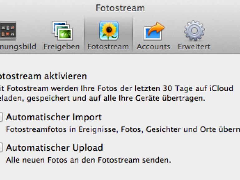Im Gegensatz zu Fotostream auf dem iOS-Gerät, lässt sich das Verhalten des Fotostreams auf dem Mac noch ein wenig konfigurieren. So können Sie über die iPhoto-Einstellungen und „Fotostream“ festlegen, dass neu zu iPhoto hinzugefügte Fotos nicht automatisch im Fotostream landen, indem Sie die Option „Automatischer Upload“ deaktivieren. Wenn Sie den Haken bei „Automatischer Import“ entfernen, verhindern Sie, dass alle Foto aus dem Fotostream automatisch auch in Ihre iPhoto-Mediathek importiert werden. Stattdessen können Sie manuell wählen, indem Sie Bilder aus dem Fotostream in die Quellenleiste ziehen.