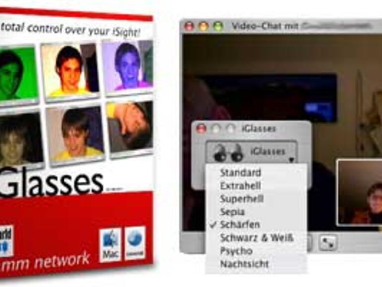 Interessant ist das rund 10 US-Dollar kostende iGlasses, weil es neben der iSight (integriert oder extern) auch die Fähigkeiten der iMage USB Webcam oder der Logitech QuickCam und einiger weiterer Webcams aufzupeppen vermag. Besonders herausragende Fähigkeiten aber verschafft iGlasses 2 der iSight von Apple, denn diese kann damit ein noch klareres Bild der Umgebung liefern. Scheinwerfer aufstellen oder Kerzen anzünden wird damit unnötig - iGlasses schafft alles digital. Und dreht dabei auf Wunsch auch noch das Bild, sollte die iSight besser seitlich am Monitor ihren Platz finden.