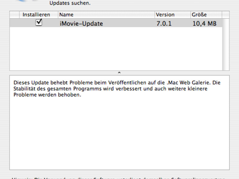 Apple hat nun mit der Version 7.0.1 ein erstes Update veröffentlicht, das Probleme bei der Veröffentlichung von Filmen im Rahmen einer .Mac-Galerie beheben soll. Außerdem sei die "Stabilität des gesamten Programms" verbessert worden, so Apple.