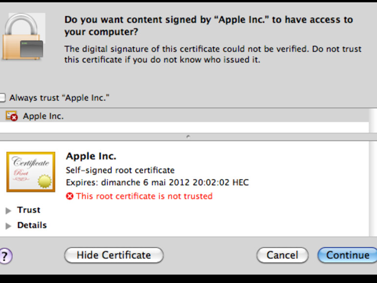 Primär abgesehen hat es der Schädling „Flashback.G“ auf Name/Passwort-Kombinationen für PayPal, Online-Banking und andere monetäre Dienste. Komplett unbemerkten Zugang zum Mac kann er sich über Sicherheitslücken in veralteten Java-Installationen verschaffen. Nötigenfalls wird eine gefälschte Zertifikat-Meldung gezeigt, die der unbedarfte Nutzer im Zweifel arglos mit „Fortfahren“ bestätigt und dem Schädling Tür und Tor öffnet.