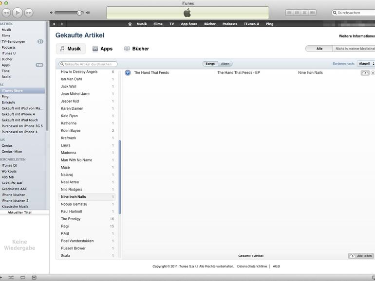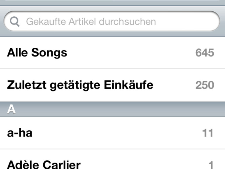 Komplett zu funktionieren scheint jedoch „iTunes in der Cloud“. Bei diesem Dienst stellt Apple alle über den iTunes Store gekauften Apps, Bücher und Musiktitel via iCloud zum erneuten Download bereit. Auf dem iPhone findet sich der Link im iTunes Store unter Gekaufte Artikel. iTunes auf dem Mac zeigt den Link hingegen auf der rechten Seite in der Kategorie Alles auf einen Blick. Bisher war „iTunes in der Cloud“ in Deutschland allein auf den erneuten Download von E-Books und Apps beschränkt.