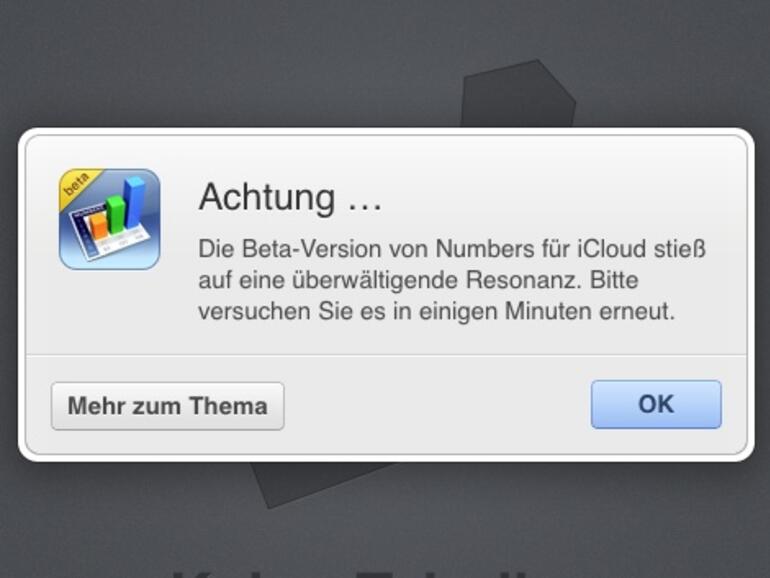Darin heißt es: „Achtung ... Die Beta-Version von Numbers fuur iCloud stieß auf eine überwältigende Resonanz. Bitte versuchen Sie es in einigen Minuten erneut.“ In der englischsprachigen Version, in der Apple übrigens die Meldung anstelle von „Achtung“ mit einem etwas zurückhaltenderem „Es tut uns leid“ betitelt, heißt es außerdem, dass der iCloud-Dateiaustausch zwischen iOS und OS X weiterhin verwendbar ist.