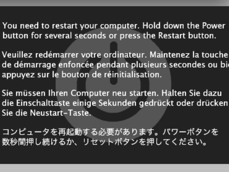 Panic kann nichts weiter und will auch nichts weiter als den grauen mehrsprachigen Warnhinweis auf dem Bildschirm einzublenden, dass man seinen Rechner neu starten solle, weil es ein ernstes Problem gab. Sogar der Mauszeiger wird eingefroren und reagiert nicht mehr, das Programm lässt sich nur noch mit [Befehl] - [q] beenden. Ein erstklassiger Kollegenschreck im Büro also: Einfach das Programm starten und ab in die Frühstückspause. Es wird nicht lange dauern, bis einen die lieben Kollegen darüber in Kenntnis setzen, dass der Rechner eine Kernelpanic hat.