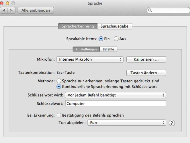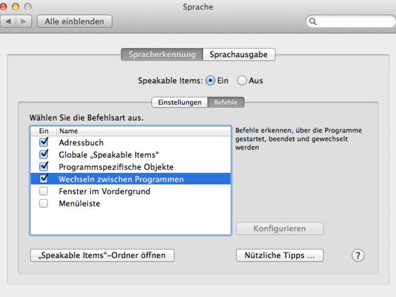 Die Sprachsteuerung aktivieren Sie über den Menü-Punkt „Speakable Items“. Zusätzlich können Sie die Tastenkombination oder alternativ das Schlüsselwort zur Eingabe-Erkennung festlegen.