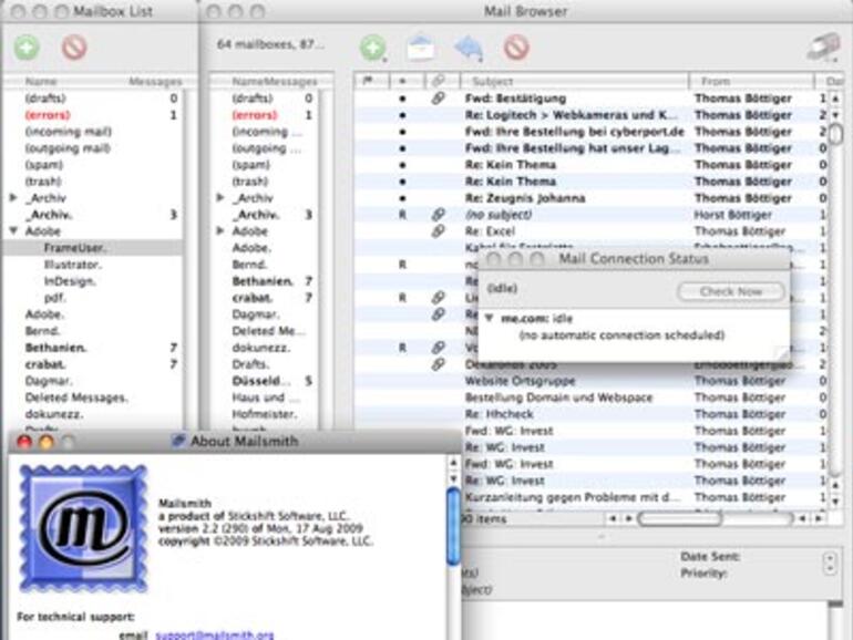 Mailsmith wird nun von Stickshift Software vertrieben, die dem Vorstandsvorsitzenden von Bare Bones gehört. Der Besitzerwechsel hat also eher eine symbolische Funktion. An der Funktionalität und dem Interface des Programm hat sich nichts geändert: "Mailsmith" sieht immer noch so aus wie BBEdit mit Internetanschluss und öffnet jeden Account in einem eigenen Fenster. Bei der Installation können die vorhandenen Accounts samt E-Mails importiert werden, was aber zu Problemen führen kann, denn Mailsmith erkennt keinen IMAP-Account, der sich in Zeiten von Googlemail und MobileMe als Quasi-Standard etabliert hat, um seine Mail von mehreren Computern aus verwalten zu können.