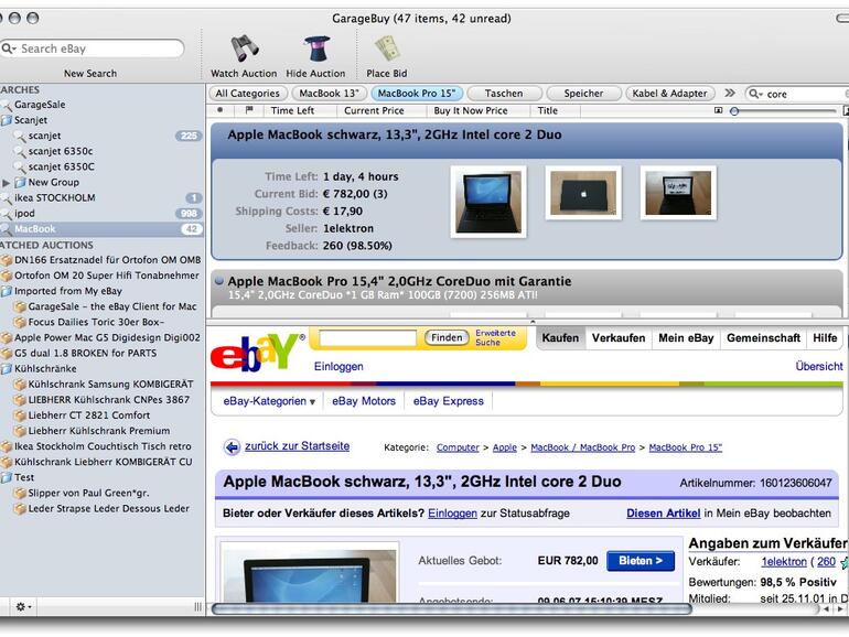 Mit dem von eBay zertifizierten GarageBuy kann der Anwender Gebote abgeben, Bildergalerien betrachten und Sucheingaben speichern.
