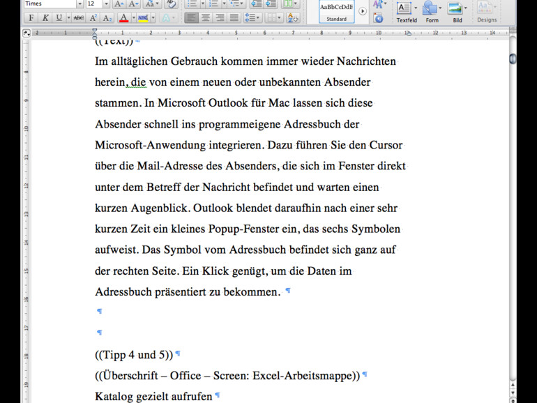 "Auf den ersten Blick scheint Microsoft mit der Oberfläche von Office 2011 den Trend der Zeit nicht richtig erkannt zu haben. Denn die aktuellen Mobilrechner besitzen einen breiten aber im Verhältnis dazu schmalen Bildschirm."