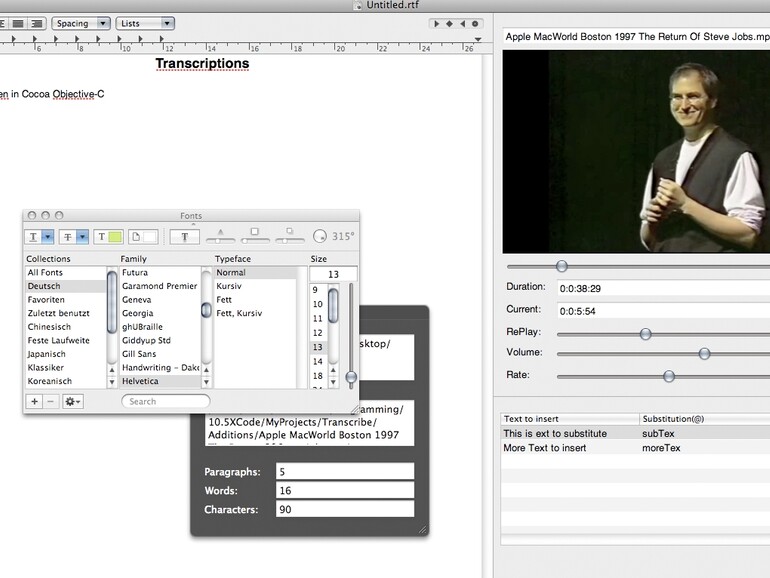 Wer allerdings den Komfort eines typischen, stark an Apples TextEdit angelehnten Mac-Programms nicht missen möchte, kann zu Transcriptions greifen: "[Das Programm] vereint die Leistungsfähigkeit einer professionellen Transkriptionssoftware mit der Einfachheit eines Macs. Jeder, der mit iTunes & Co. umgehen kann, wird sich sofort Zuhause fühlen", versichert Dr. Dresing. Unterstützt werden alle QuickTime-kompatiblen Audio- und Videoformate, erweitern lässt sich die Palette mittels Fremdanbieter-Plug-Ins wie Perian und Flip4Mac.