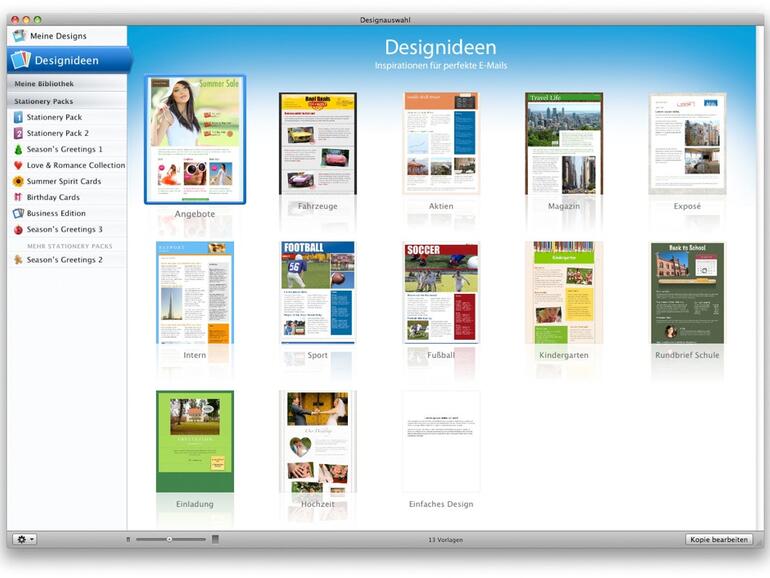 Grafiker, Agenturen und Unternehmen können mit Mail Designer das Corporate Design in Mail-Vorlagen übernehmen und ohne Aufwand dynamische Inhalte einbinden: Um Ideen schnell und einfach umzusetzen, enthält Mail Designer Grafiken, editierbare Text-Objekte und modulare Text- und Bildplatzhalter. Durch intuitive Werkzeuge, Lineale und Hilfsmittel entstehen Kunden-Newsletter direkt in Mail Designer ohne technische Umwege. Jedes Design lässt sich als Mail-Vorlage abspeichern und mit den gleichen Designelementen an Mitarbeiter oder Kollegen verteilen. So kann ein Team aus verschiedenen Abteilungen mühelos an einer Design-Vorlage gemeinsam arbeiten. Wer bereits die Mail-Vorlagen der Stationery Pack Business Edition verwendet, kann diese mit Mail Designer bearbeiten und seinem eigenen Geschmack anpassen. Außerdem ist Mail Designer laut equinux zu allen weiteren Grußkarten der Stationery Pack und Collections von equinux kompatibel.