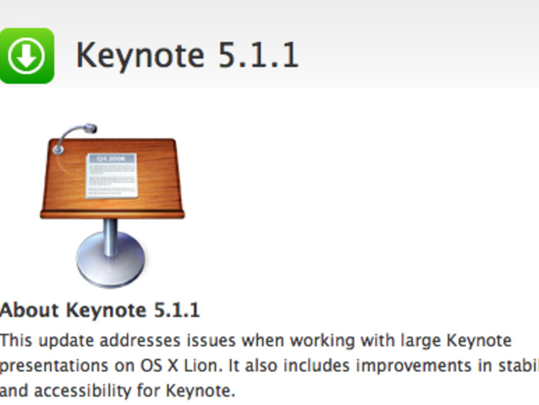 Version 5.1.1 von Keynote kommt je nach Methode der Erstanschaffung der Anwendung unterschiedlich zum Kunden. Über den Mac App Store gekaufte Lizenzen sind wiederum über den Mac App Store, genauer über dessen „Updates“-Funktion zu aktualisieren. Für Käufer der Papp-Schachtel von iWork steht der 29,94 MB kleine Download über die Softwareaktualisierung und diesen separaten Link zur Verfügung.
