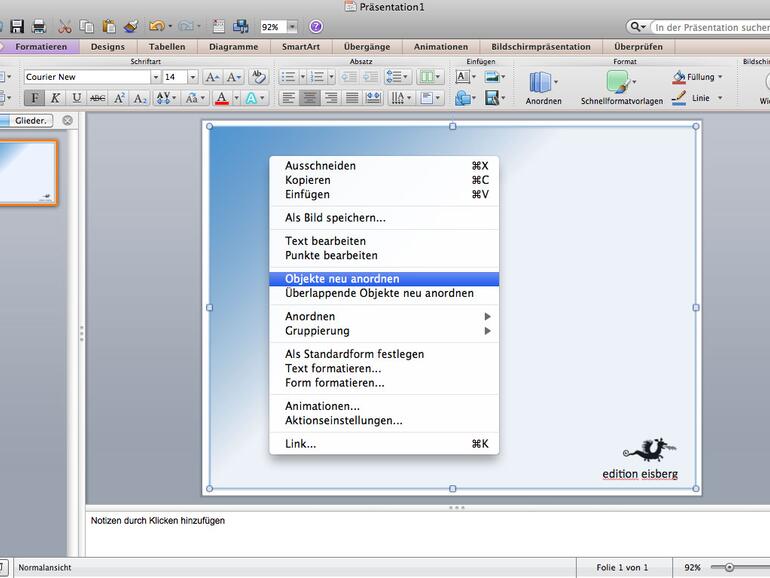 Fügen sie nun Logo und Schriftzug hinzu. Für Letzteres öffnen Sie ein Textfeld, geben den benötigten Text ein. Klicken Sie mit der rechten Maustaste in die Folie und wählen Sie Objekte neu anordnen. Schieben Sie die Ebenen mit Logo und Schriftzug nach hinten und bestätigen Sie.