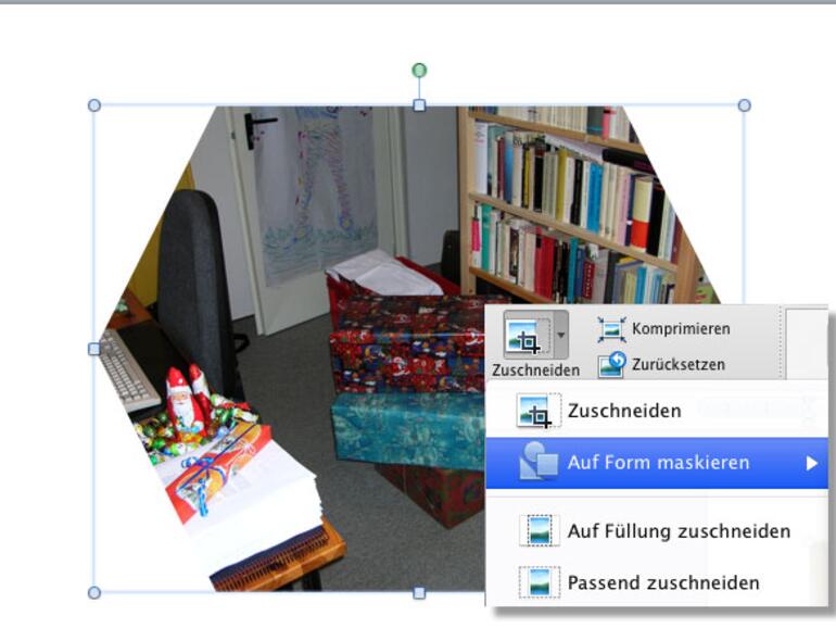 Interessant sind die Möglichkeiten, die Sie im Bereich Zuschneiden finden. Word blendet Ihnen alle Funktionen eines Werkzeugs mit einem Klick auf den kleinen Pfeil neben dem Schalter ein. Neben dem einfachen Zuschnitt, also dem Entfernen nicht benötigter Bildbereiche, verwandeln Sie mit Auf Form maskieren das Foto schnell in eine Form um. Dazu genügt es, sich die gewünschte Vorgabe auszuwählen.