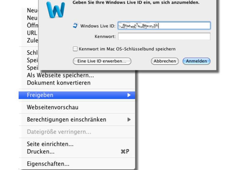 Führen Sie im Menü Datei das Kommando Freigeben aus. Entscheiden Sie sich dort für Auf Skydrive speichern. Zur Nutzung ist eine Live-ID notwendig, die Sie kostenlos von Microsoft erhalten. Wenn Sie ein Hotmail-Konto besitzen, verfügen Sie automatisch über eine solche Kennung. Geben Sie in dem Dialog Ihre ID und das Kennwort ein.