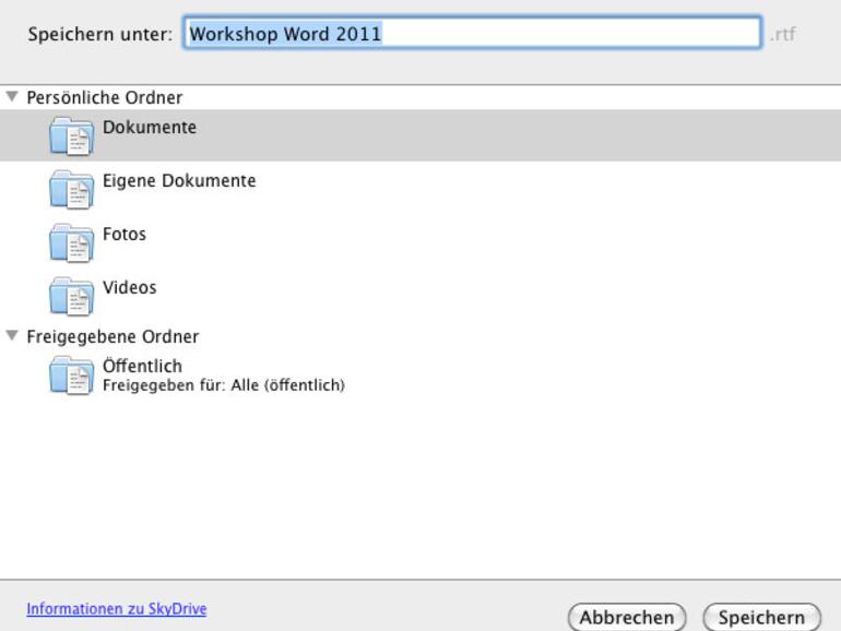 Sind Sie verbunden, blendet Word die Ordnerstruktur des virtuellen Laufwerks ein. Entscheiden Sie sich für einen der Ordner und geben Sie einen Namen für die Datei ein. Klicken Sie dann auf Speichern. Die Rechte an einem Dokument legen Sie mit dem Browser auf der Skydrive-Seite unter https://login.live.com fest.