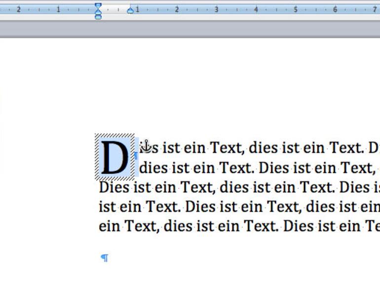 Drücken Sie die Hochstell- und die Pfeil-nach-rechts-Taste. Der Buchstabe, der zum Initial werden soll, ist nun markiert. Wählen Sie Format > Initial. Bei Position wählen Sie Im Text. Die Initialhöhe stellen Sie auf 2. Den Abstand zum Text legen Sie auf 0,2 cm fest. Bestätigen Sie alles mit OK.