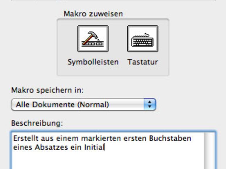 Angenommen, Sie arbeiten häufger mit Initialen – das sind die ersten Buchstaben eines Kapitels, die groß vom restlichen Text abgesetzt werden. In alten Büchern wurden diese oft kunstvoll ausgeschmückt. In Word müssen Sie dazu den Buchstabe markieren, den Befehl Initial auswählen, die Position einstellen sowie Initialhöhe und Textabstand bestimmen. Müssen Sie das häufiger machen, etwa in einem umfangreichen Buchmanuskript, ist ein Makro eine gute Hilfe, weil man statt der Wiederholung aller Schritte nur das Makro anwerfen muss. Sie schalten den Makrorekorder über Extras > Makro > Aufzeichnen ein und über den gleichen Weg wieder aus, nur dass der Befehl dann Aufzeichnen beenden lautet.