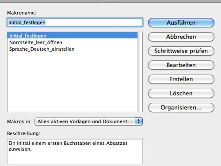 Um das neue Makro zu überprüfen, machen Sie die Arbeit am besten wieder rückgängig (Bearbeiten > Rückgängig) und stellen so die Ausgangssituation wieder her. Wenn sie jetzt Extras > Makros wählen, das Makro in der Liste markieren und auf Ausführen klicken, sollte das Initial erneut erzeugt werden.