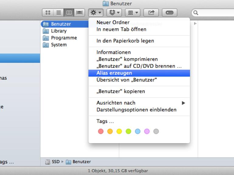 Eine andere Möglichkeit ist es, einfach ein Alias zu erstellen, denn das wird auch nach einem Neustart weiterhin angezeigt. The Loop hat diesen Tipp veröffentlicht. Dazu klickt man im Finder über das Kontextmenü auf „Alias erzeugen“ und hat dann eine permanente, wenn auch nicht ganz so elegante Lösung.