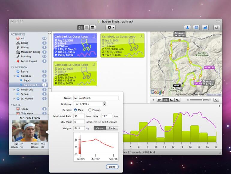 Die Software rubiTrack kann, basierend auf GPS-Daten, Outdoor-Aktivitäten analysieren und organisieren. Auslesen lassen sich zum Beispiel Strecken von GPS-Geräten wie dem Garmin Forerunner, Garmin Edge oder anderen kompatiblen Geräten. Verschiedene Ansichtsmöglichkeiten wie "Kalender" oder "Liste" helfen dabei, Daten wie zurückgelegte Strecken, Geschwindigkeiten etc zu überblicken und zu kategorisieren. Die aktuelle Version 1.0.1 von rubiTrack enthält hauptsächlich Fehlerbehebungen.