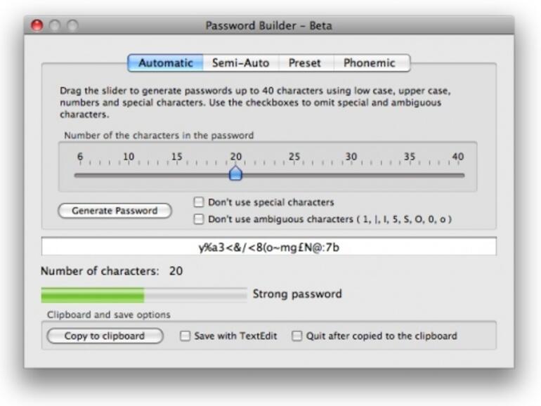 Password Builder erstellt nach dem Zufallsprinzip bis zu 40 Zeichen lange Passwörter. Vier Arten von Passwörtern lassen sich je nach Vorstellung des Anwenders erstellen, z. B. komplett automatisiert oder auf Grundlage einer Vorgabe. Das fertig generierte Passwort lässt sich dann einfach in die Zwischenablage kopieren und/oder über einen Texteditor abspeichern. Die Software liegt in englischer Sprache vor und steht hier zum Download bereit. Passwort Builder 1.0 benötigt mindestens Mac OS X 10.5 und ist lauffähig auf PPC- und Intel-Macs.