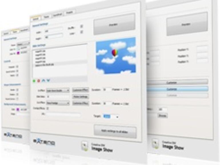 Mit "Creative DW Image Show" von Extendstudio können verschiedene Übergangseffekte für Diashows erzielt werden. Hier kann aus über zwanzig Effekten (unter anderem "Zoom" etc. gewählt werden), das Paket ist ebenfalls für 50 US-Dollar erhältlich.