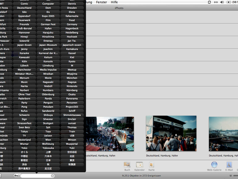 Das wahre Problem steckt in der Suchfunktion. Diese bietet inzwischen vier Suchmöglichkeiten, die über ein Menü ausgewählt werden können. Wird "Schlagwörter" gewählt, kann kein Suchbegriff eingegeben werden, stattdessen erscheint eine graue Palette mit allen Schlagwörtern. Diese Palette ist nicht skalierbar und auf vier Spalten beschränkt. Dies führt zum einen dazu, dass die Palette sehr viel Platz auf dem Bildschirm belegt und zum anderen sind unter Umständen gar nicht alle Schlagwörter sichtbar. Als Abhilfe bleibt nur die Gesamtsuche übrig, man sollte nur darauf achten, nicht nach Begriffen zu suchen, die in den Ereignisbeschreibungen stehen, da sonst zu viele Fotos angezeigt werden.