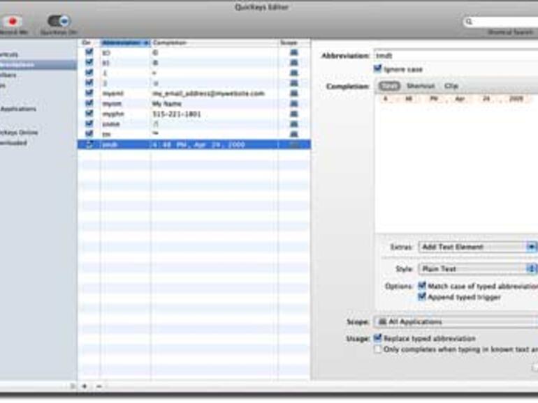 QuicKeys automatisiert Arbeitsabläufe, indem ein Prozess wie bespielsweise die Stapelverarbeitung von Bildern und deren Upload auf den Server aufgezeichnet und mit einem Tastenbefehl definiert wird. Die Befehlsketten lassen sich auch nachträglich ändern und mit neuen Tastenkürzeln versehen, so dass auch umfangreichere Aktionen mit einem einzigen Tastendruck gestartet werden können.