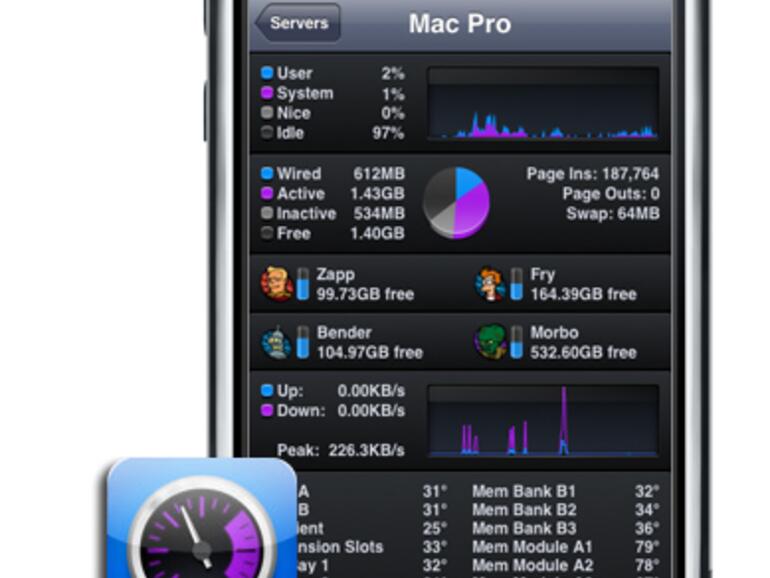 Wie mit dem kostenlosen Widget “iSlayer iStat pro” können mit der App “iStat” (iTunes-Link) die CPU-Leistung, die RAM-Auslastung, der belegte Festplattenplatz, die Netzauslastung sowie die Temperaturen verschiedener Systemkomponenten überwacht werden.