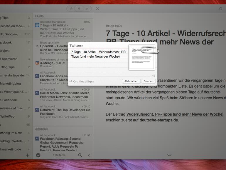 Für die weitere News-Verwaltung stehen aktuell Readitlater und Readlist bereit. Dazu gibt es die gewohnte Anbindung an die sozialen Netzwerke Twitter und Facebook, um News schnell weiterzugeben. Mit der Einbindung der Mac-Apps Mail und Nachrichten lassen sich die Links zu den entsprechenden Artikel versenden. Weitere Dienste sollen folgen. Reeder hat einen integrierten Browser, kann die Feeds aber auch an Google Chrome weitergeben. Safari wird derzeit nicht unterstützt.