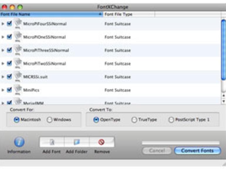FontXChange kann zwischen OpenType, PostScript Type 1, TrueType und anderen Schriften-Typen zwischen Mac und Windows konvertieren, ein Batch-Prozessor ermöglicht das Konvertieren ganzer Schriften-Bibliotheken.